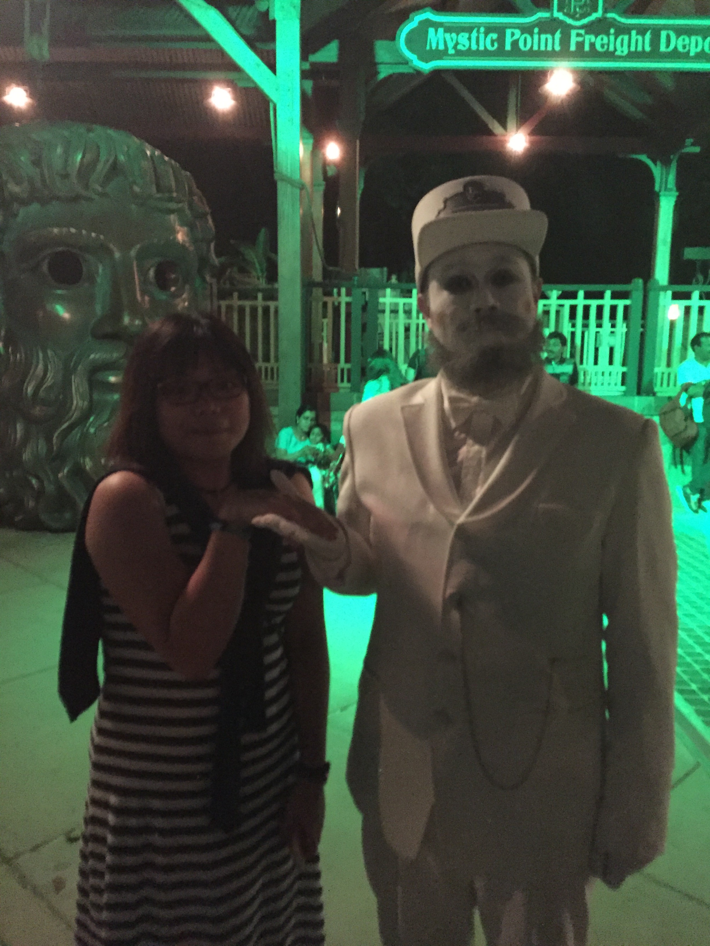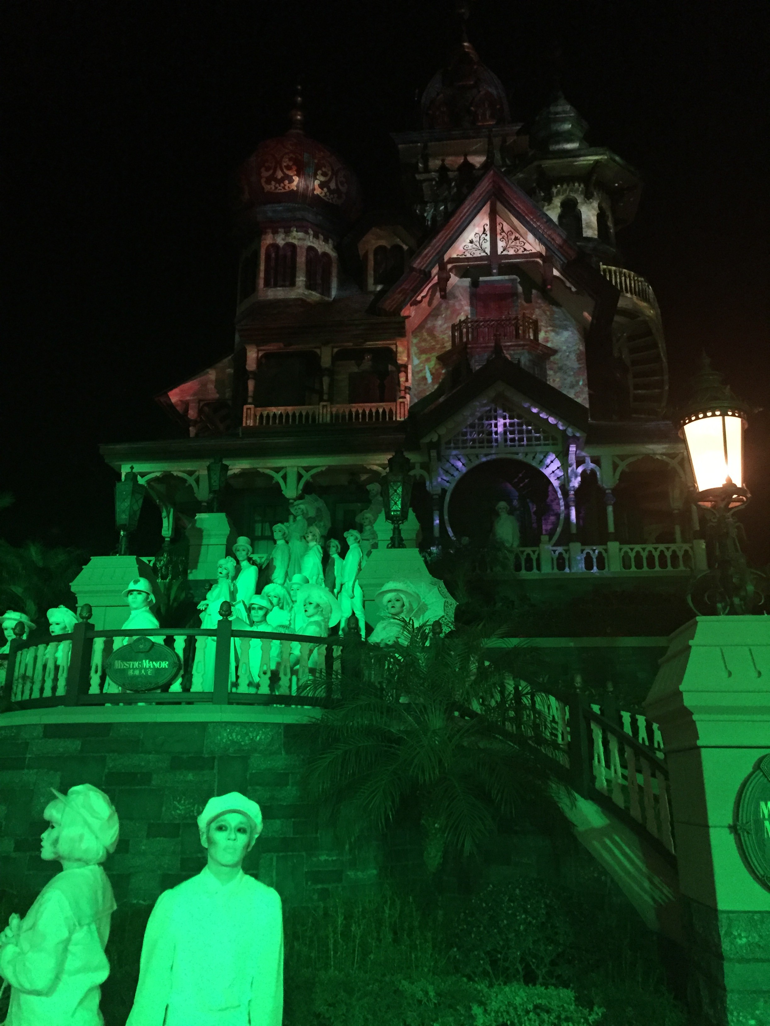 迷離莊園是我們的下一個目的地,我們本來以為莊園裡面會新增為萬聖節而設的機關,最後才明白莊園的外面,才是真正要表演的地方。在詭異的燈光之下,幢幢的鬼影從莊園現身。在過來之前,我們看見一個全身白色、推著嬰兒車的婦人背影,狀甚怪異,才曉得原來她就是表演中的表演,只見他們全身塗上白漆,穿上厚重又華麗的衣服,穿過途人,列隊遊蕩,表現相當專業。