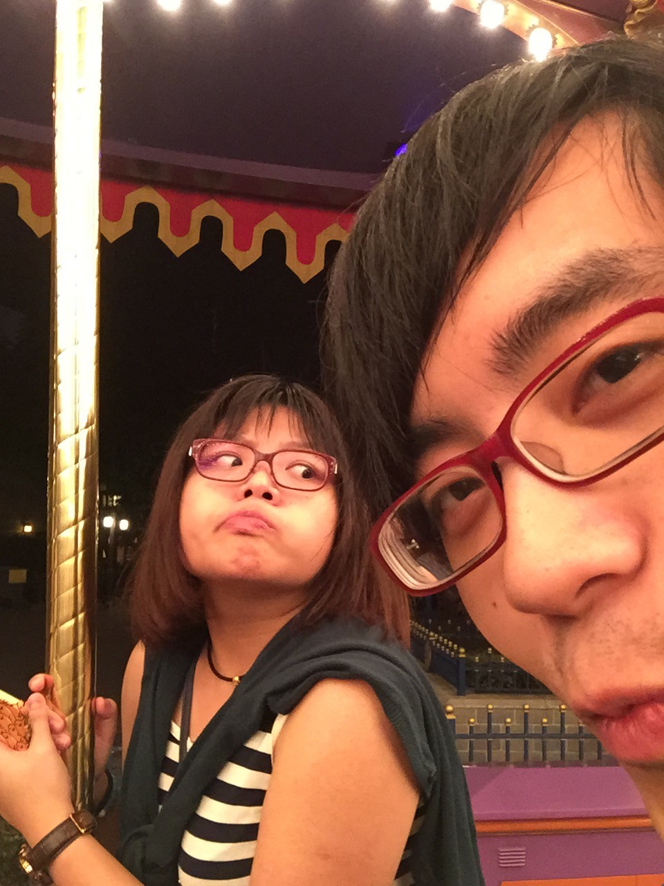 讓我倆第一個排隊的是森林河流之旅,為了迎合萬聖節主題,河流之旅換成了咒石迷蹤。雖然一等就等了差不多半小時,然而涼風習習,伴著微弱的月色,我們都不覺得等了很久,倒是我們善用等待的時間,時而輕聲細語,時而盡情嬉笑,大概是我們輪候的經驗中,最愉快的一次了。