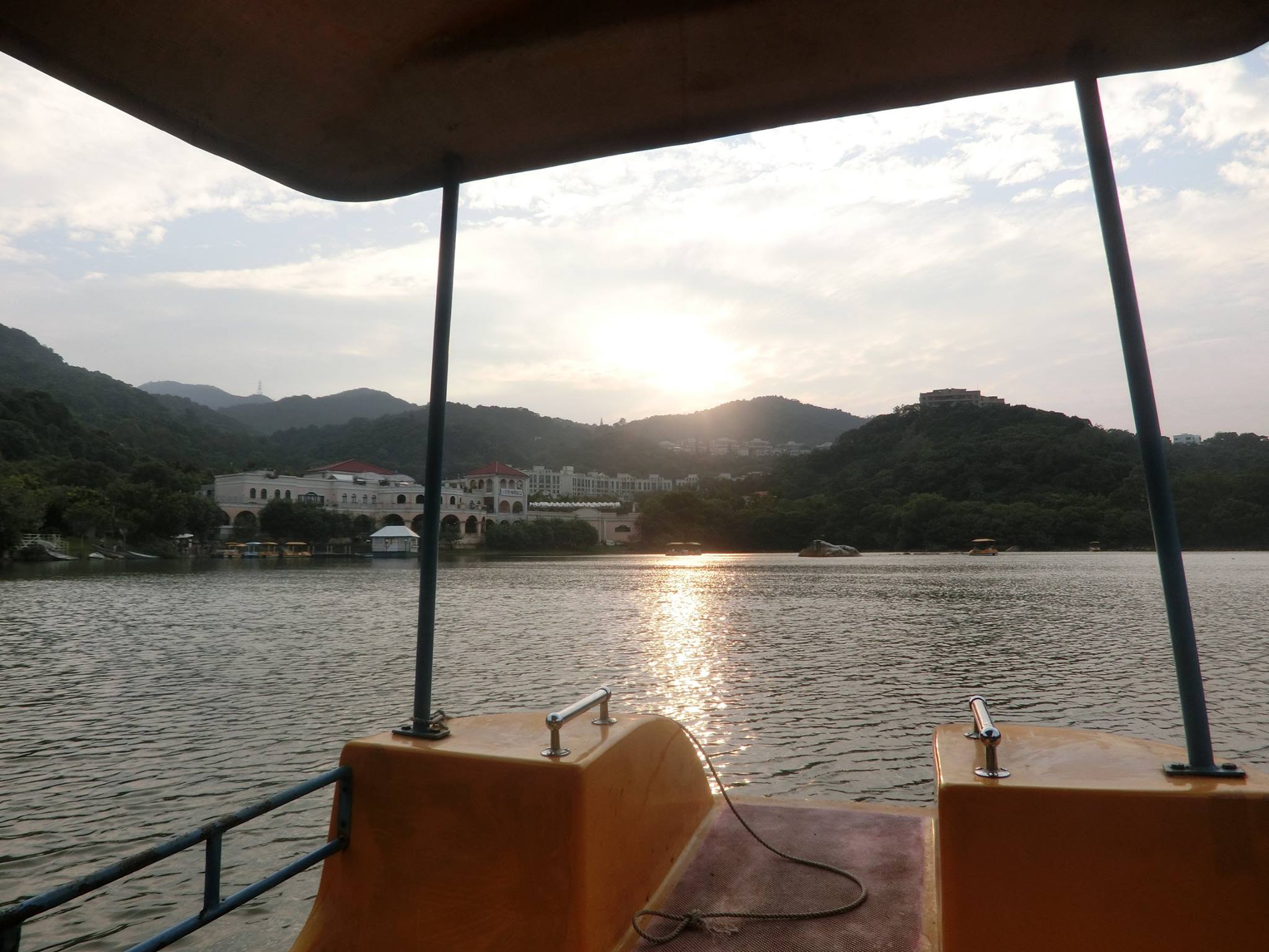 劃過湖邊的樹,看見火車經過的地方,平日乘火車路經大埔墟站,總會看見一個偌大的湖,湖上一對對情侶騎著水上單車,如今在湖上的換成我們,看著女友傻傻的向車上的人揮手,一陣幸福感油然而生,在寧靜的湖面上泛舟而行,遠離一切煩囂,這樣的機會可不多。