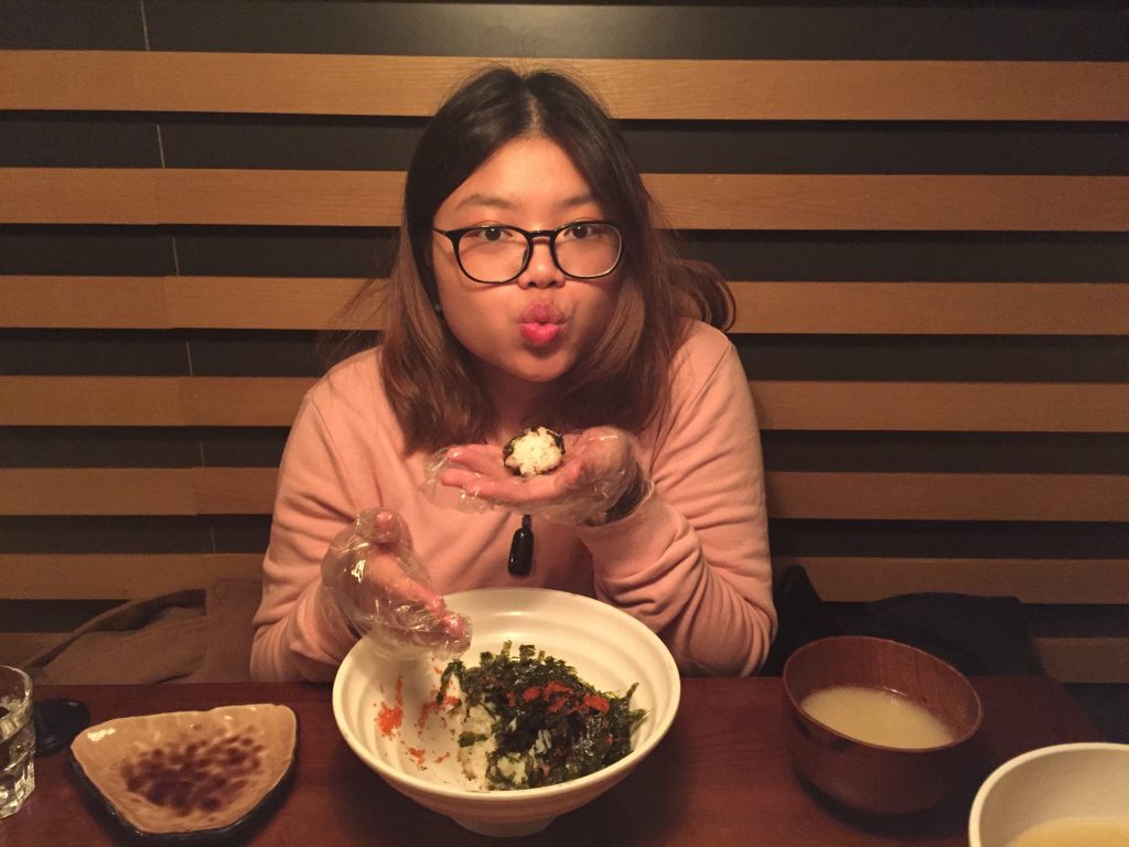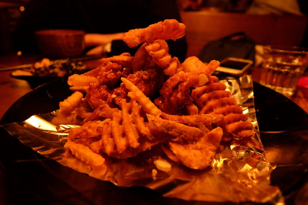 說到韓式料理,炸雞當然就是靈魂。這裡的炸雞口味多不勝數,上次光顧的時候,因為在座的人都不嗜辣,只能叫上蜜糖炸雞,蜜糖炸雞配上同樣是甜的米酒,就略顯過甜了,並不能完全嚐到炸雞的香味。這次難得跟女友一起品嚐,我們叫了一道甜辣炸雞,配上自製韓式飯團,米酒則選擇了清爽的柚子味,整個配搭就顯得合理很多。炸雞雖然還是頗甜,但柚子的甘爽,跟米酒搭配得很好,淺嚐一口,酒香四溢,這裡還有韓國oppa上菜,女友不知道是覺得好笑還是滿足,臉上掛著一副好奇的笑容。她就這樣一邊帶著笑意,一邊搓著飯團,我忍不住替她拍了幾張照片,記下這有趣的一刻。